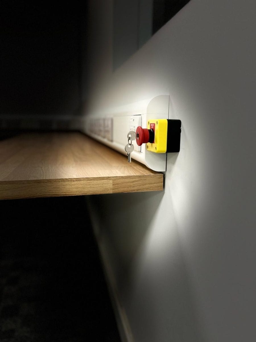 Independent emergency stop buttons for each socket, enabling localised power isolation for enhanced safety and compliance.