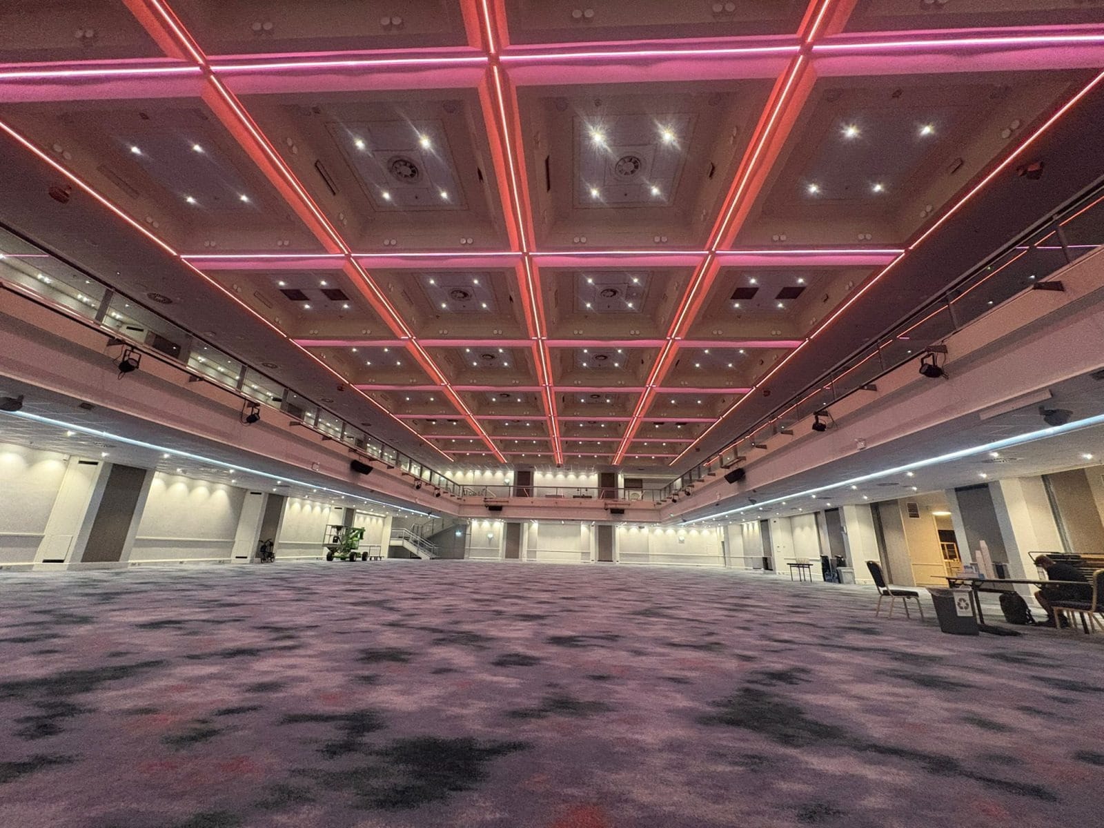 This state-of-the-art upgrade provides seamless dimming and full colour control, enabling the space to adapt effortlessly to a wide range of events, from corporate conferences to elegant weddings.