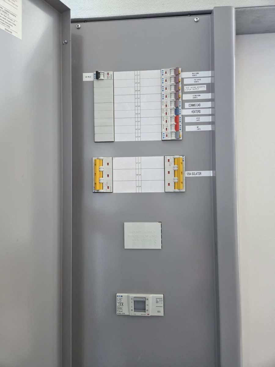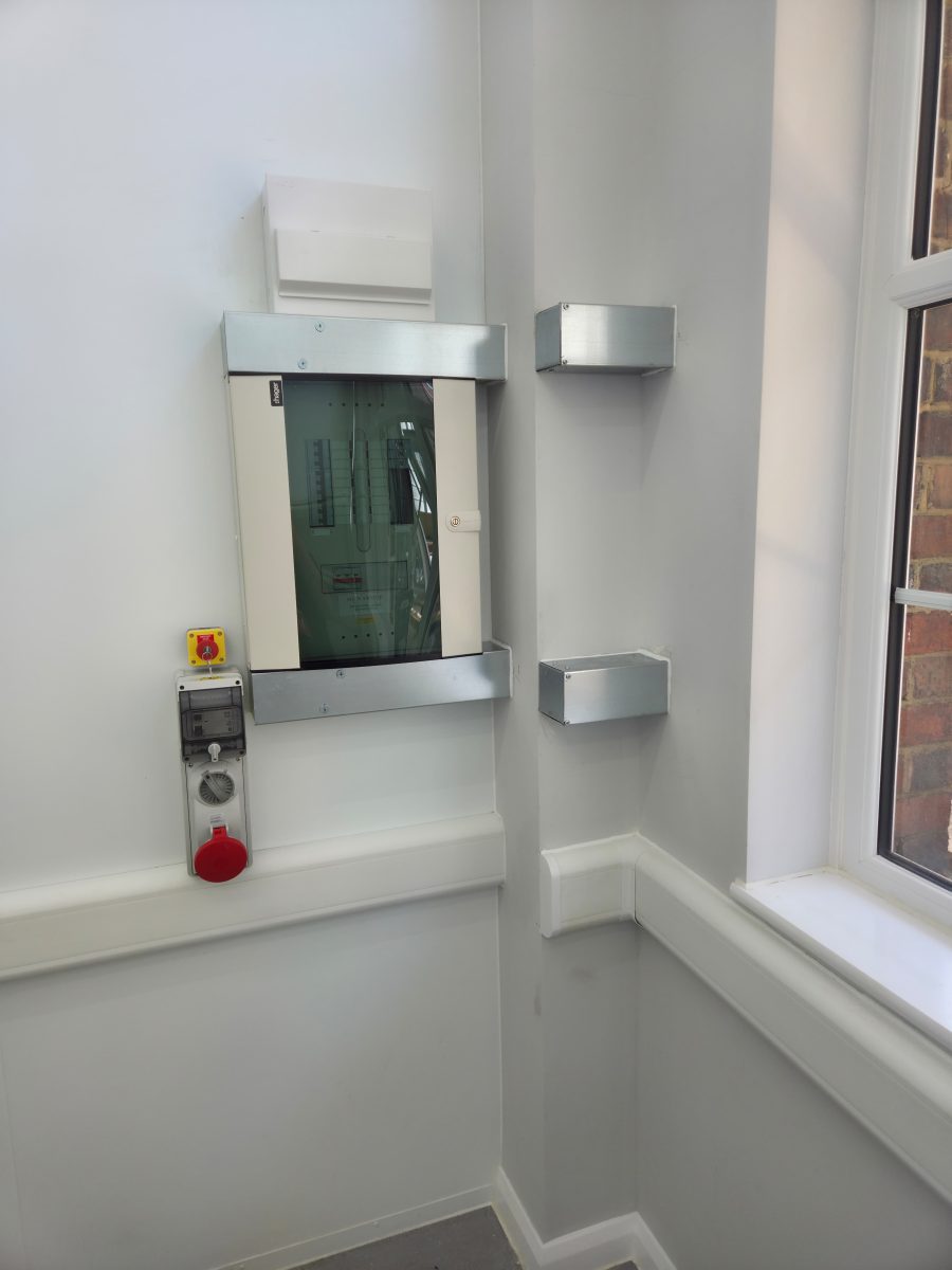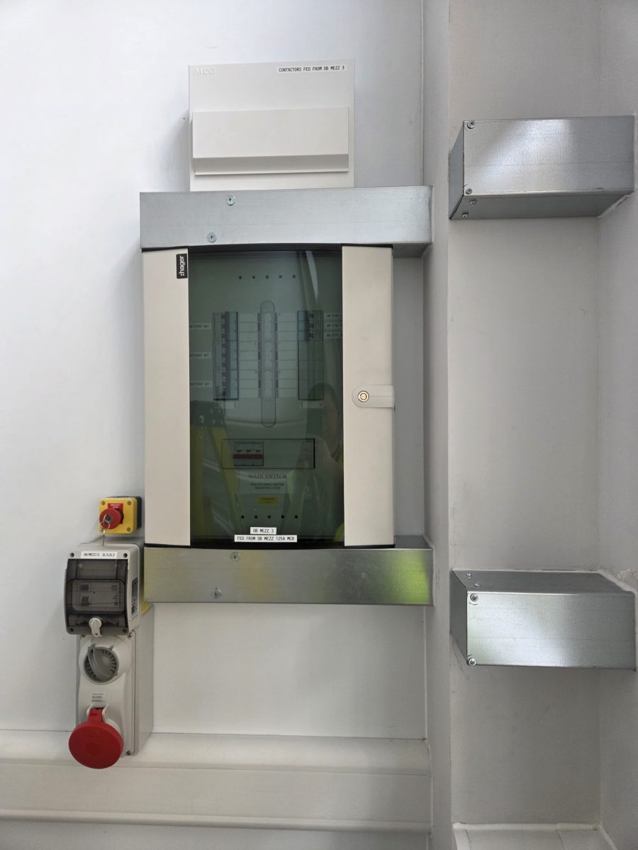 Electrical and data installation in Rugby. Scope of works included: Full electrical fit-out with perimeter dado trunking, CAT 6a data cabling to support high-speed connectivity, desktop trunking serving eight workstations for clean, functional desk setups, a new Hager distribution board complete with emergency stop facility for enhanced safety, installation of mechanical ventilation to ensure effective airflow and compliance.