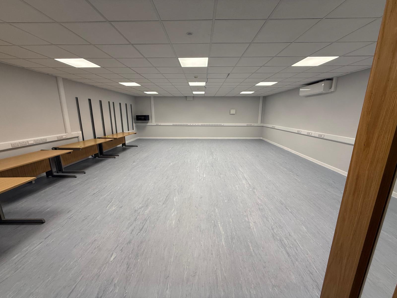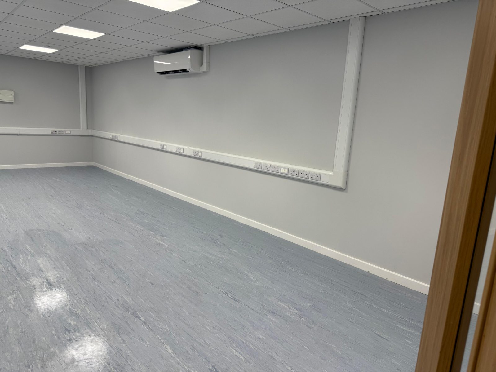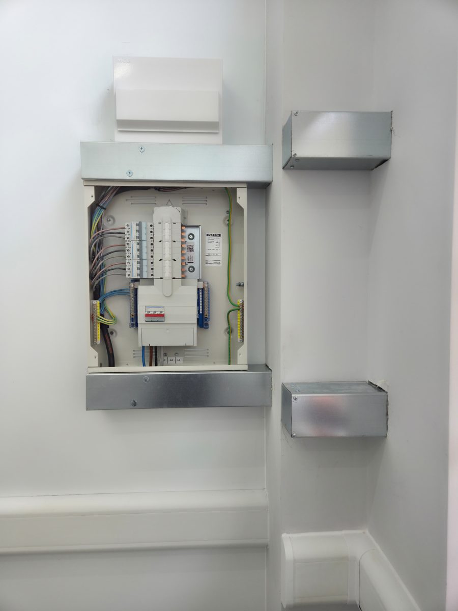 Electrical and data installation in Rugby. Scope of works included: Full electrical fit-out with perimeter dado trunking, CAT 6a data cabling to support high-speed connectivity, desktop trunking serving eight workstations for clean, functional desk setups, a new Hager distribution board complete with emergency stop facility for enhanced safety, installation of mechanical ventilation to ensure effective airflow and compliance.